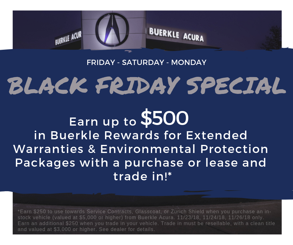 Exclusively at Buerkle Acura, we’re also offering $250.00 in Buerkle Rewards for extended warranties and environmental protection packages with each purchase, lease or trade-in. Double that to $500 if you purchase and trade in! Bonus to Buerkle Rewards is only valid Friday (11/23/18), Saturday (11/24/18), and Monday (11/26/18).